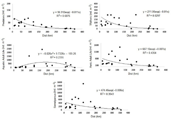 Therefore, the distance from the spring (Dist) was confirmed to be an optimum descriptor for data variability and can be robustly contrasted with community indices and biological/functional traits. The most fitted regression models for community indices are presented in Table 4 and Figure 3. Statistically significant regression models were found for all the taxonomic indices except N and for only one functional index (FRic). Negative exponential monotonous models were chosen for S, d and Fric, while polynomial relations were selected for H’, J and λ with the latter two showing a clear decreasing trend at central values. Table 5 shows the statistically significant regression models selected for the biological traits. Among the feeding groups, “predators” is the only attribute with a significant relation. Other statistically significant results were observed for adult life (both aquatic and aeric life habits), mobility (walker taxa) and reproductive frequency (semelparous taxa). No significant variations along Dist gradient were found for life span and habitat choice. Aquatic adult life habit is the only significant attribute showing polynomial/unimodal relation with Dist with higher individual densities at central Dist values, while a negative exponentially relation was found for the other traits (Figure 4).