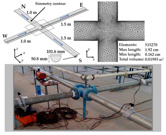 The experimental model was carried out on a 0.1016 m galvanized iron cross from an experimental WDN of the University of Guanajuato. Electromagnetic flow meters and a digital storage oscilloscope with four measuring channels were used to monitor the flow and pressure values. The WDN can conduct flows up to 30 l/s at pressures of 1.78 bar. The CFD model of the cross was formulated considering the main elements of the experimental model. The experimental model, the geometry, and mesh specifications of the CFD model are shown in Figure 2. The CFD module of the COMSOL Multiphysics software, version 4.3b, was used to solve the RANS equations according to the standard k-ε model, which works with the high Reynolds number turbulence. This model was validated by the stimulus-response technique, generating Residence Time Distribution curves according to the experimental tracer measurements of four scenarios. The formulation and validation details, for the hydraulic and the outlet concentrations, are described in [9].