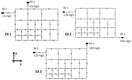 Three water quality cases, EX1, EX2, and EX3 are shown in Figure 4. In all cases, two Reservoirs (RVs) with a source concentration are located in different positions. The EX1 scenario was performed to analyze the distribution of a non-reacting chemical during the flow simulation, in order to represent a possible contaminant event in WDNs. In the EX1 scenario, the reservoir RV1 supplies 1.5 mg/l of a substance, while RV2 provides clean water (Figure 4). EX1 has two demand nodes located at the lower corners of the network, with demands of 10 l/s (left) and 20 l/s (right), to generate various operational mixing flows on the nine CJs with two contiguous inlets and outlets without demand.