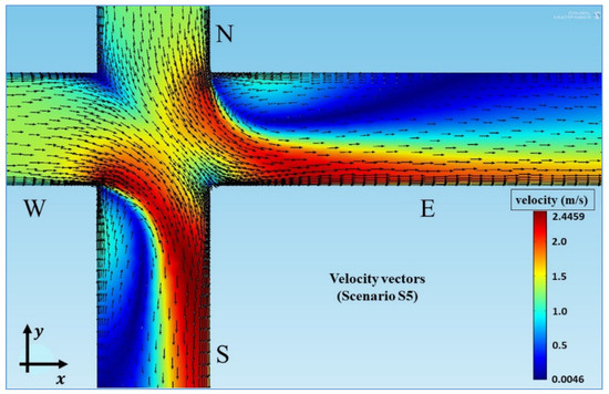 An example surface graph with the velocity vector field of scenario S5 is shown in Figure 5. It can be verified that the vectors move in a collision-course at the inlet flows N and W. This causes an instantaneous contact in a reduced fraction of the flows, but the occurrence of a perfect mixing in this flow contact is not possible. Similar observations were discovered in [6,7]. There are areas with low velocity and even recirculation of the flow just at the beginning of the outlet pipes E and S. This is also due to the thrusts generated by the collision of the flows at the cross.