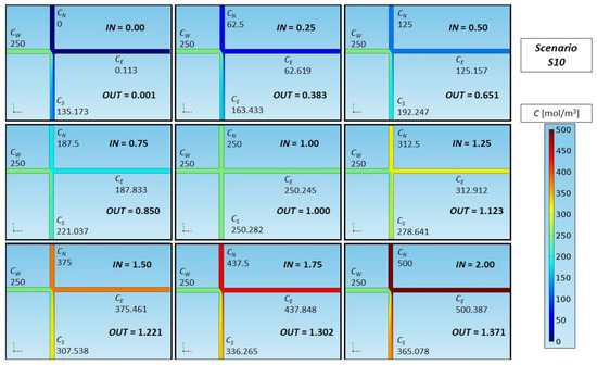 On the other hand, the S11 scenario has the highest outflow at the E boundary. A convective shove makes an important concentration contribution from both CN and CW inlets to the E outlet. The curves in Figure 7 for scenarios S10 and S11 should have different behaviors due to this. The trace of scenario S11 has the lowest slope, thus the trace of scenario S10 should be the highest slope. However, the behavior of the S10 trace took a decaying curved shape for values of IN>1. This happened due to the way the OUT coefficient is calculated. Emphasizing the first subfigures in Figure 6, for IN values less than 1, since E is not receiving a sufficient amount of W, the CE concentration has values close to the adjacent inlet CN (this also happens in [14,19] and is an important property of Epanet-BAM [15]), but when IN>1, both E and S outlets receive a lot of CN concentrate due to CN being greater than CW.