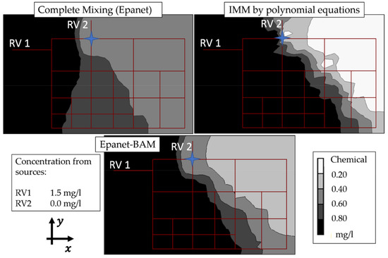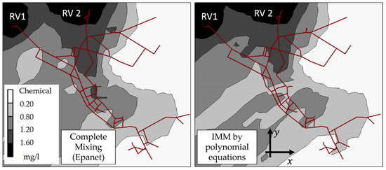 Some extreme results on this EX1 network were registered. For example, the first CJ, below RV2 (marked in Figure 8), has 0.00 and 1.50 mg/l for CN and CW inlets, respectively. The complete mixing of Epanet assumes that each outlet CS and CE should leave 0.40 mg/l. Applying the IMM by polynomial equations, the concentrations outlet are 0.8371 and 0.0007 mg/l for the CS and CE, respectively. This can happen since there is a very high difference between the inlet flows at QN and QW, about 16.60 and 6.05 l/s, respectively. The differentiated flow-impact generates a minimum concentration contribution from the W inlet (1.50 mg/l) and in the same way, the North concentration (0.00 mg/l) is conserved in a higher proportion since it has the predominant flow rate (QN is near 300% in respect to the QW). These results are consistent with [14,16,18]. The Epanet-BAM and the IMM by polynomial equations result in similar contour plots, which in most of the nodes the concentrations are above 0.8 mg/l. However, the east sector has an even lower concentration in the IMM by polynomial equations. EX1 has a sector where several nodes do not reach the value of 0.20 mg/l (this is the minimum concentration in Epanet-BAM). This shows that in contamination events, the IMM by polynomial equations could obtain more severe scenarios than the complete mixing model.