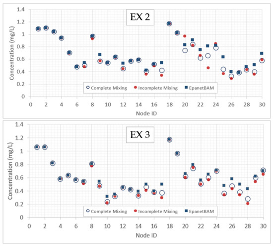 The EX2 and EX3 scenarios were carried out to analyze the differences between the mixing models representing the disinfection on WDN considering water consumption in all the nodes. The concentrations of the chemical in the RVs represent the values of chlorine supply by the water treatment plants (according to Mexican Normative) and the reaction coefficients are applied to simulate the decay of residual chlorine. The World Health Organization recommends that the concentrations for chlorine on all nodes should be between 0.2 to 0.5 mg/l, although in Mexico government regulations specify a maximum value of 1.5 mg/l. Subfigures EX2 and EX3 have different positions for the RVs. All the junctions have a demand of 1 l/s. The RVs concentrations are 0.65 and 1.20 mg/l, and the reaction coefficients kb and kw used are −1.512 d−1 and −0.275 m/d, respectively. The kb coefficient was obtained in a real network from the city of Guanajuato, Mexico [31] and kw is an average of the findings of some authors [32,33,34].