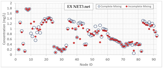 EX2 and EX3 scenarios were closer to the complete mixing, possibly since the RV were placed in opposite areas of the network (this is a similar case to [16]) and this balanced the flow rates and allowed a more homogeneous concentration distribution. These cases are similar to the simulation of disinfection in WDN, that the IMM by polynomial equations has an effect on specific nodes.