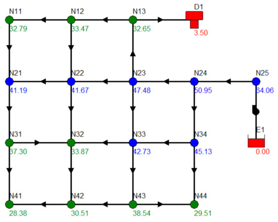 In the next iteration, the CN corresponds to the N44, with an initial pressure of 29.51 m. Reducing the pressure to 20 m at this node implies incorporating two ER devices on lines N34-N44 and N43-N44, each with a pressure drop of 9.51 m. In summary, the final solution corresponds to that shown in Figure 4d. After the entry of the two ER devices of the last iteration, all the lines of the network are canceled, since it is not possible to install any ER device without modifying the flows. Therefore, the definitive process of the methodology is concluded.
