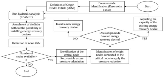 Some studies carried out on PRE are mainly based on the energy diagnosis of the network [2]. This work allows end-uses to be determined with sufficient precision to identify the greatest inefficiencies (e.g., leaks, friction, pumps) and the greatest potential savings. Once the overall analysis is complete, the focus shifts to those aspects or solutions with the highest cost-benefit relationship. Other authors [3,4,5] propose pumps working as turbines (PATs) or performing control with pressure reducing valves (PRVs). Both cases seek to control excess pressure and its direct relationship with leaks in WDNs. The difference is the first would have PRE and the other would be associated with pressure control in the technical management of the networks. Samora et al. [6], study the PRE and propose a methodology to quantify the hydroelectric potential from excess energy in a network. Their results demonstrate the existence of PRE, but only for a single study case. Their methodology does not locate the best points to extract this energy, but rather performs an energy recovery (ER) on certain devices already installed. Likewise, they consider a premise there is no variation in the demands of the analyzed network.