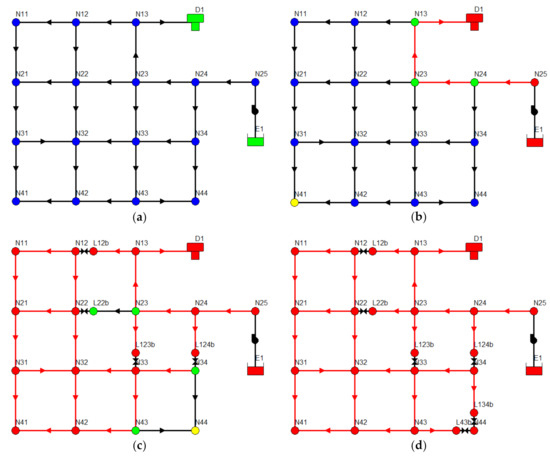 The data of this network is collected in the Supplementary Material section of this work. The initial iteration identifies two OrNIs: E1 and D1. Consequently, lines N13-D1, N23-N13, N24-N23, N25-N24 and E1-N25 are canceled, since the installation of an ER device in any of them implies a variation in flow distribution (see Figure 4, Initial iteration). Through this cancellation, new OrN are generated at nodes N13, N23 and N24, where the CN is N41 (pressure equal to 28.38 m), which implies an excess energy (pressure) of 8.38 m. This implies the installation of four ER devices on lines N12-N13, N22-N23, N23-N33 and N24-N34 (see Figure 4, Iteration 1). These new ERs lead to the cancellation of the lines marked in red (see Figure 4, Iteration 1) to keep the pressure at node N41 equal to 20 m. Therefore, new OrNs appear: NL22b, N23, N34 and N43.