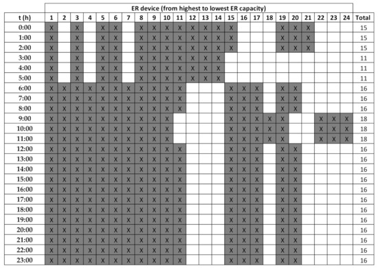 When the methodology is applied to networks with dynamic models, a series of results such as those in Table 4 are obtained at time step. The problem is the ER devices obtained in all cases are not the same at all time steps. Figure 5 shows the results obtained in the Anytown network. Each horizontal line of the figure represents the results in each time step. All the devices are represented vertically from highest to lowest energy recovery capacity. Each cell represents if the device of the column recovers energy at the instant represented by the line. If the device recovers energy, the cell is marked with an X, otherwise the cell is blank. Not all devices recover energy at all times. In fact, the number of ER devices varies from one instant to another, oscillating between 11 and 18. Something similar happens with the Net3 and C-Town networks.
