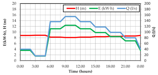 In the definition of energy supplied by the reservoirs Equation (6), R is the set of origin or source nodes; Doutk,t is the total flow supplied by the node k at instant t and Hi,t is the head calculated at the same node and instant. When defining the energy supplied by the pumping systems Equation (9), P represents the set of pumps; Pj,t and ηj,t corresponds to the power supplied and the performance of the pump j at instant t; and γ is the specific weight of the water.