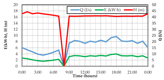 The ER capacity of devices varies over time. The following figures show the data obtained for the devices with the most ER capacity in the three cases (Anytown, Net3 and C-Town). In each of the graphs (Figure 6, Figure 7 and Figure 8) the red line represents the head (energy loss) of the ER device, the flow is represented in blue and the ER in green. Logically, the ER is directly linked to the flow. Although not in all cases, the device that recovers the most energy is active during all time steps. In the Net3 network, the device is disconnected from 18:00, while in C-Town the device is only disconnected only at 8:00.