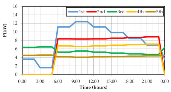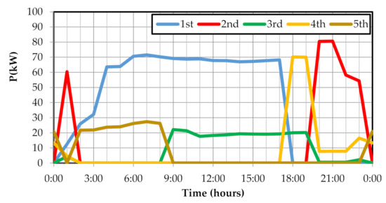 The power recovered by each element (Figure 9, Figure 10 and Figure 11) varies with time. The PREn is obtained by integrating each device. In this way, a table similar to Table 4 of the Balerma network is obtained for each network. As in the case of the Balerma network the 6 devices with the highest capacity are collected (Table 5, Table 6 and Table 7). The rest of the values are included in the Supplementary Material.