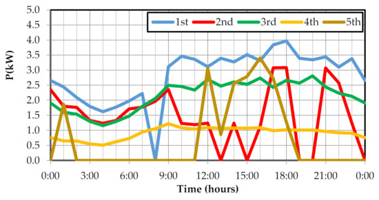 The results from the different devices vary over time. Figure 6, Figure 7 and Figure 8 show the energy recovered by the device with the highest capacity in each network. The variation in the device with the highest capacity is not maintained in the rest of the network devices. In each case, this variation depends on the topology and the specific characteristics of the network. Figure 9, Figure 10 and Figure 11 show the variation in the energy recovered in the five devices that recover the most energy.
