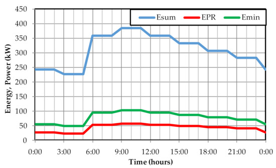 The other part of the energy consumed can be considered as useful energy. This useful energy would correspond to the sum of the minimum energy required in the nodes (Emin) and the excess of energy supplied with respect to the minimum required (Eex). The minimum energy required (Emin) can be expressed as the sum of the topographic energy available (Eu,e) and the minimum pressure energy required at the nodes (Eu,p). The potentially recoverable energy represents the excess energy over the minimum supplied to the nodes. For its part, the energy recovered corresponds to that recovered in the network by already existing elements.