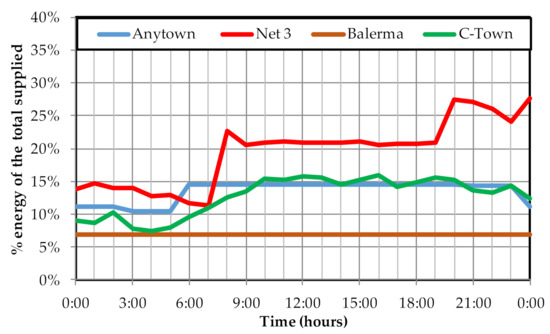 The Balerma network is analyzed with a steady state model. This is a classic network model used in optimization benchmarking problems. The analysis of this network allows visualizing the capabilities of the proposed methodology without considering the variation of the operation network over time. The rest of the networks (Anytown, Net3 and C-Town) are analyzed using extended period models. Each of them has different simulation duration. However, in order to be compared, the three networks have been analyzed with the same time base (24 h simulation with 1 h time step). This will make possible to extend the validity of the methodology not only for instantaneous analysis of network operation, but also to assess the energy consumed over time.