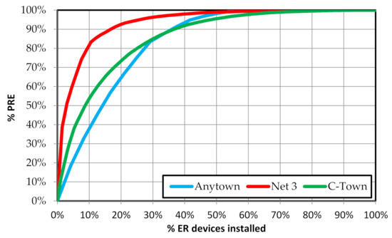 The methodology has been applied to the four selected case studies and the details of which are indicated previously. The results of the Balerma network are different from those obtained in the other three networks. The Balerma network is a static model that represents a single operating state. Therefore, the results that can be obtained are the maximum PREn, as well as the possible location of the ER devices.