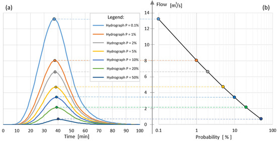 Based on the defined duration of design rainfall and IDF curves (intensity–duration–frequency curves) for the analyzed region [52], the hydrological model determines the runoff hydrographs from rainfalls of different probabilities of occurrence. The main assumption defines an equal relationship between the probability of the occurrence of road overtopping and the probability of the occurrence of the design rainfall that leads to the overtopping occurrence. Runoff hydrographs of the different probability of occurrence are shown in Figure 4a, while Figure 4b shows the regression dependence between the peak value of runoff hydrograph and the probability of occurrence of the design rainfall.