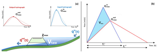 (a) Schematization of the hydrograph transformation model and (b) the triangular approximation of the inlet and outlet hydrograph.