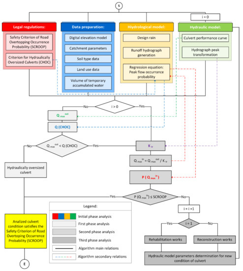 The CMOOP algorithm for small mountain catchment was formed to assess the current condition of the culvert, as well as effects of rehabilitation or reconstruction works, based on the legally defined safety criterion of the overtopping occurrence probability. The analyses of the CMOOP algorithm were systematized into initial, first, second, and third phase analyses, and this is presented in Figure 7.