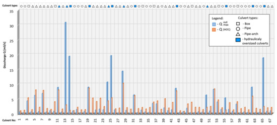 The culverts with Qmaxin higher than Q(SCROOP), or culverts positioned above the red line in Figure 9, are culverts with the existing condition that satisfies the SCROOP criterion. Grouping data around the division line implies that a great majority of culverts on the analyzed road section had satisfied the SCOOP in the designed condition. With the exclusion of hydraulically oversized culverts, a total of 37.03% of culverts meet the SCROOP criterion in their present state. By including the hydraulically oversized culverts in the calculation, then 49.25% of the analyzed culverts on the studied road section satisfy the SCROOP criterion which corresponds to the statistics obtained in similar research [26,69]. Statistical results produce a conclusion that culverts on the analyzed road section were properly designed, although the design of the complete road section was done almost fifty years ago with limited hydrological data. The current condition of culverts that do not satisfy the SCROOP can be improved by the application of rehabilitation or reconstruction works.