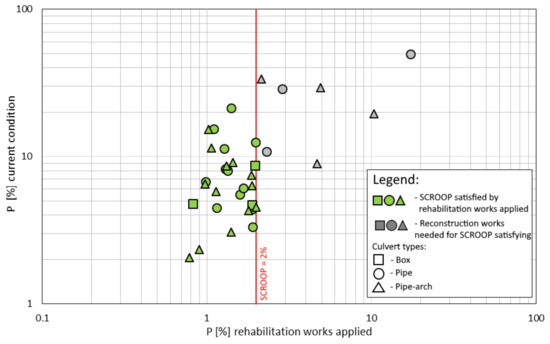 The analysis of the rehabilitation works application effects on the culverts which current condition does not satisfy the SCROOP (Figure 10) shows that application of the rehabilitation works can ensure that 82.35% of those culverts meet the SCROOP criterion. According to the CMOOP algorithm, for the remaining seven culverts, which are hydraulically undersized, the application of reconstruction works to satisfy the SCROOP criterion is needed. The reconstruction works can apply different techniques for satisfying the SCROOP criterion, from designing the new inlet/outlet structure to the complete replacement of the analyzed culvert.