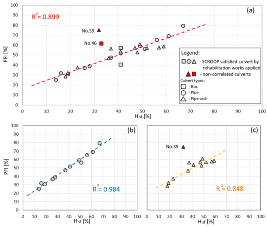 Correlation between Hsf and PFI for culverts that satisfy SCROOP after application of rehabilitation works: (a) for all culverts, (b) for pipe culverts, and (c) for pipe arch culverts.