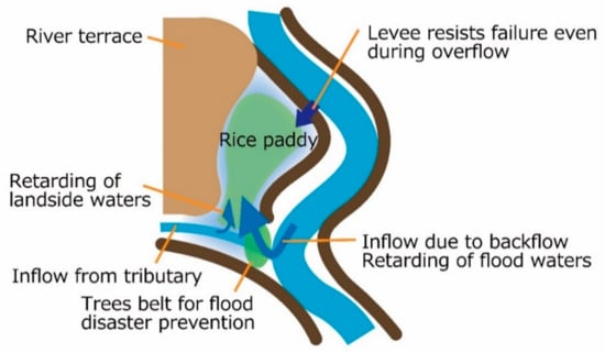 In Okawano, the traditional river technology includes the use of embankments, a flood-restraining forest belt, and microtopography to enhance flood control capabilities. Consequently, in addition to the normal ecosystem services provided by paddy fields, it was possible to not only reduce damage to the farmlands but also create a culture of providing temporary refuge for fish and harvesting the displaced fish.