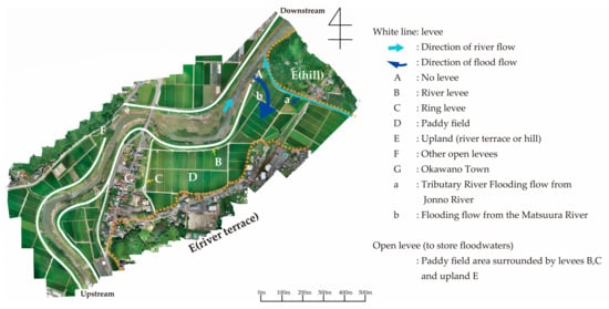 Our findings suggest that the open levee on the flood plain in Okawano allowed up to 378,203.0 m3 of floodwater to be stored by allowing the floodwater to flow in reverse through the opening provided on the downstream side into the space enclosed by the levees and river terraces. During this process, the inundation inflow and outflow behaviors occurred naturally, depending on the water level of the Matsuura River. Furthermore, owing to the extremely slow flow velocity, no significant damage occurred to the paddy fields. The nearby houses and facilities were also undamaged. Therefore, it appears that the open levee on the flood plain in Okawano could handle the inundation with only minor losses.