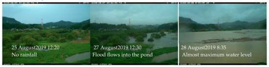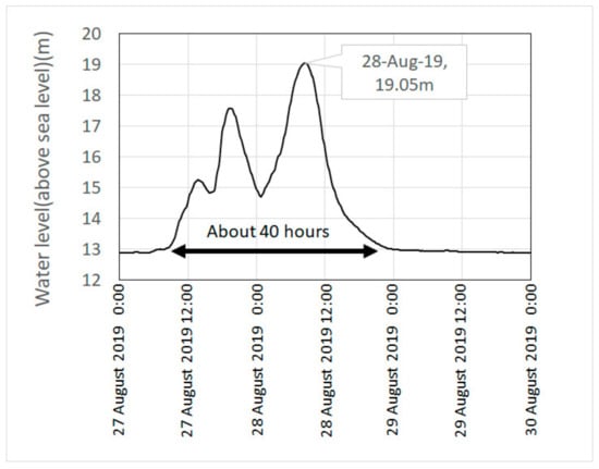 It is concluded by examining the water level gauge records at the time of the flood that the flood lasted approximately 40 h, with the water level rising approximately 6 m, and the water flooding the paddy fields to a depth of approximately 3.2 m (Figure 4).