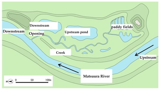 - Saito, K. Movement and spawning of several freshwater fishes in temporary waters around paddy fields. Jpn. J. Ecol. 1988, 38, 35–47. [Google Scholar]