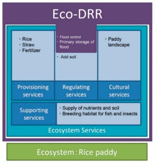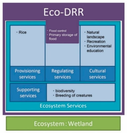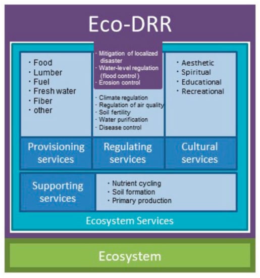 Originally, Eco-DRR involved the concept of ecosystem services, especially with respect to disaster prevention capabilities. Within the four elements of ecosystem services (provisioning services, regulating services, cultural services, and supporting services), Eco-DRR fell under “regulating services.” Regulating services include weather regulation and disaster abatement and mitigation []. The International Union for Conservation of Nature (IUCN) states that “ecosystem-based disaster risk reduction refers to decision-making activities that take into consideration current and future human livelihood needs and biophysical requirements of ecosystems, and recognize the role of ecosystems in supporting communities to prepare for, cope with, and recover from disaster situations” []. In other words, Eco-DRR refers to not only a framework for ecosystem-based disaster prevention capabilities, but also ecosystem-based mechanisms for confronting disasters (focused on disaster prevention capabilities) by means of the multifaceted functions of the associated ecosystem services.