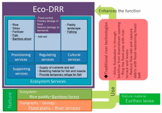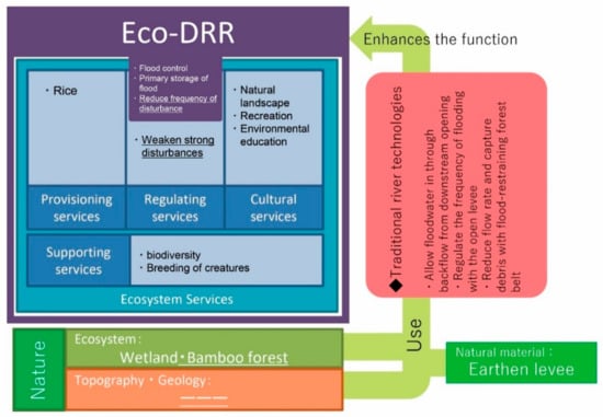 Thus, the traditional river technology has an ecosystem-based disaster prevention function, and also enhances the function of ecosystem services by utilizing aspects from nature such as topography and natural materials. Ecosystem services that may be enhanced by the addition of traditional flood control technology include not only disaster prevention functions but also provisioning services and cultural services. These comprehensively enhance the disaster resilience of the region.