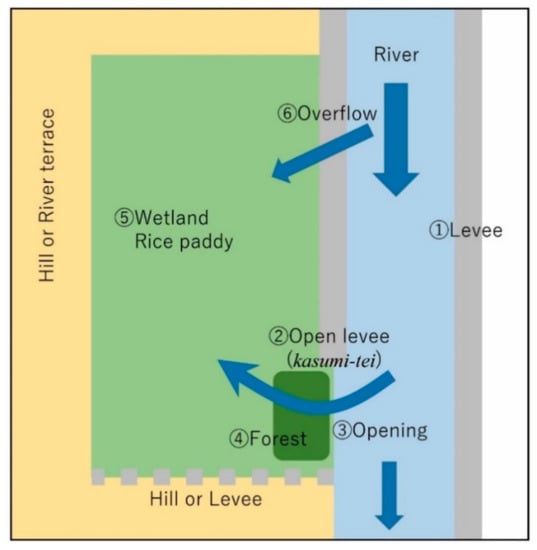In the Okawano district, which is located in the heart of the Matsuura River basin, there is a traditional flood control structure called a kasumi-tei, usually translated as “open levee”. Kasumi-tei is a generic term for the traditional Japanese technology of discontinuous open levees, which fall into two categories [].