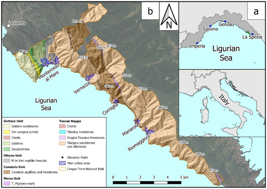 (a) Geographic location of the study area; (b) Cinque Terre National Park geological map (modified after Raso et al. [49]; blue areas show the location of the historic coastal hamlets).