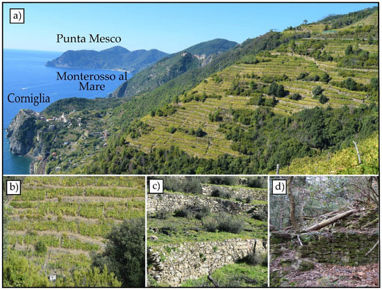 (a) Overview of the agricultural terraced landscape typical of the Cinque Terre National Park. In the lower-left corner, the Corniglia hamlet, while in the background the Punta Mesco headland and the Monterosso al Mare village are shown; (b) well-maintained terraced slope cultivated with vineyards; (c) abandoned terraces with poor cover (the growth of shrubs is visible); (d) abandoned terraces with dense cover (tree species are visible).