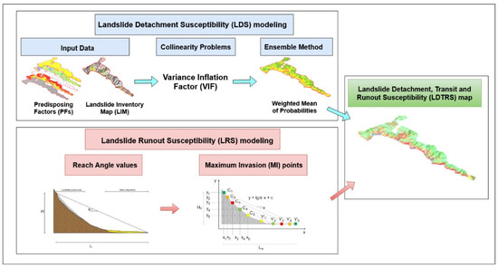 The second step was aimed at modelling Landslide Runout Susceptibility (LRS). The “reach angle” approach [72] was adopted and implemented on a Geographical Information System (GIS), allowing to identify Maximum Invasion (MI) points of landslides and to establish their degree of susceptibility. Eventually, as a third step, information coming from the previous analyses were used to generate the Landslide Detachment, Transit and Runout Susceptibility (LDTRS) map.