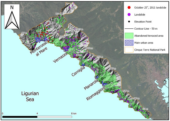 The name Cinque Terre (literally Five Lands) originates from the five historic coastal hamlets of Monterosso al Mare, Vernazza, Corniglia, Manarola and Riomaggiore (Figure 1). These hamlets are located in the easternmost Liguria region (north-western Italy), along a coastal stretch which represents a worldwide known tourist attraction. Because of its environmental, cultural, and historical heritage, the Cinque Terre area was listed as a World Heritage Site by UNESCO in 1997 and was declared National Park in 1999.