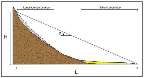 Graphical representation of the “reach angle” method (from Sarno basin Authority [108], modified and redrawn): α: reach angle; H: height difference (m) between the landslide source area (i.e., landslide crown) and the farthest edge of the landslide deposit; L: travel distance (m).