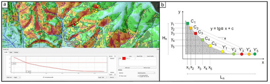 The reference values of the reach angle for the two different slope types (i.e., channelled and open/planar) were obtained through the definition of the modal values. During the second phase, using the LDS map as a base map, different topographic sections were drawn. These sections identify the hypothetical/potential path that a detached landslide could travel. The sections were drawn along the main creeks, in case of channelled slopes, and along the maximum slope line, in case of open/planar ones. Topographic sections were automatically obtained using the Profile tool plug-in [109] in open-source QGIS. In the third phase, MI points were identified for different potential detachment points positioned in the upper part of the slope (Figure 6a). The straight-line equation Equation (2) was used to define the MI point corresponding to a certain potential detachment point. Such a straight-line is described by the following equation: