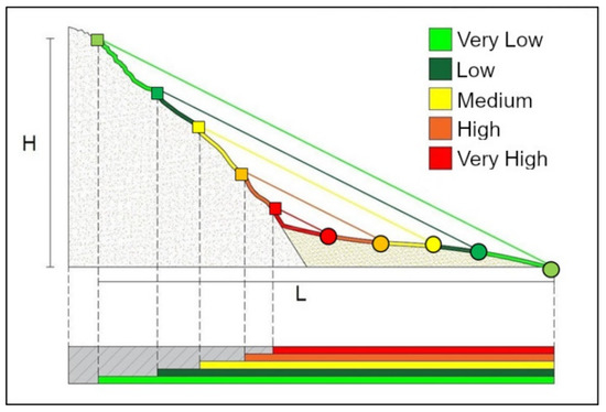 In the first phase of LRS assessment, values of H and L were carefully measured, in an open-source GIS environment. This was carried out both for landslides triggered along or upstream of channels and for failures on open/planar slopes. Subsequently, the reach angle was calculated through the following formula Equation (1):