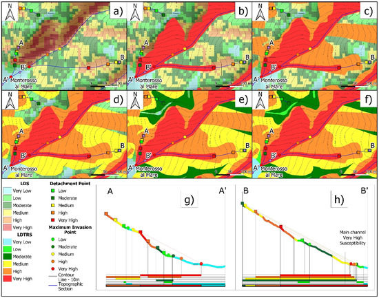 Representative steps followed to obtain the LDTRS map. The selected area is located close to Monterosso (western sector of the Cinque Terre National Park). (a) Details of the LDS map with topographic profiles (blue lines) and MI points (circles); (b) envelope procedure for areas with “very high” LDS degree including information derived from the LRS assessment. (c–f) harmonization of areas with “high”, “medium”, “low” and “very low” LDS degree, respectively. (g) and (h) examples of real topographic profiles that outline the conservative approach applied during the areas enveloping procedure; the susceptibility values along each profile refer to sub-figure (a); the final susceptibility value is shown in the bar at the bottom of each picture and refers to sub-figure (f).