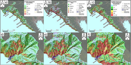 The final product is a detailed LDTRS map resulting from the integration of the procedures used for LDS and LRS assessment (Figure 9a,b). In this way, besides susceptibility to shallow landslides detachment, both transit and runout susceptibility were taken into account (Figure 9c,f). The analysis of LDTRS map (Figure 9c) highlights differences in the spatial distribution of susceptibility. Generally, terraced coastal slopes show high and very high susceptibility. Regarding the inland portions of the territory, high susceptibility values can be observed within the Vernazza catchment and in the areas behind the Monterosso al Mare hamlet. Interestingly, in the Vernazza catchment, there is a marked difference in susceptibility values between the western and the eastern side of the basin. In this case, the greatest landslide occurrence and susceptibility values were found on the right side of the catchment. On the other hand, the lowest landslide susceptibility classes are located at a higher altitude. Furthermore, most of the stream channels show high susceptibility values, highlighting their crucial role during debris flows runout.