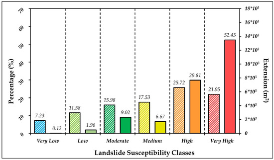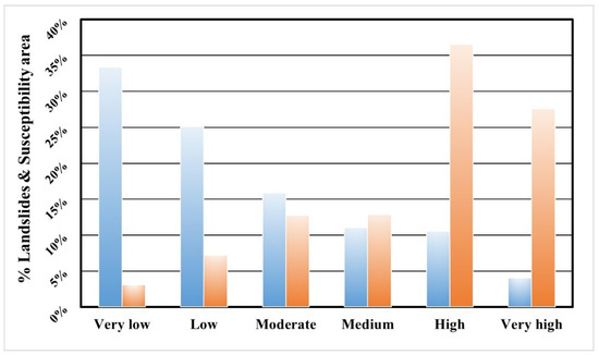 As can be seen from Figure 10, the distribution of landslides is characterized by an increasing trend, with the highest number of landslides placed in the high and very high susceptibility classes (ca. 63%). On the contrary, the areal distribution shows a decreasing trend, with the majority of areas characterized by low and very low susceptibility values (ca. 58%) and a small area characterized by higher values (ca. 14%). The opposite direction of the two trends reveals that most of the landslides fall within the highest susceptibility classes, although the range recognized as susceptible has a limited extension.