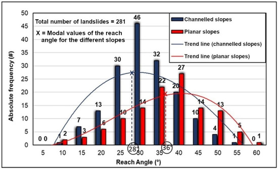 Frequency distribution of reach angle values for landslides that occurred on channelled and open/planar slopes.