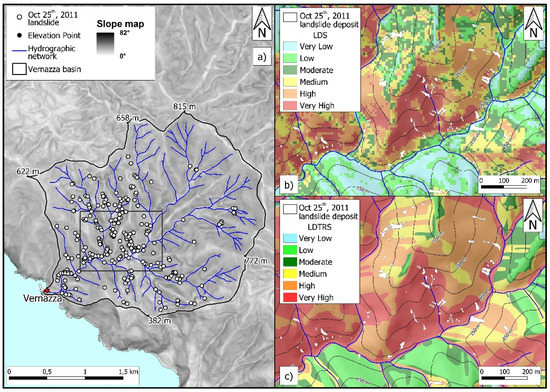 (a) Slope map of the Vernazza catchment; the black frame represents the area shown in detail; (b) and (c) detail of the LDS and LDTRS maps, respectively, with superimposition of deposits of a shallow landslide triggered on 25 October 2011.