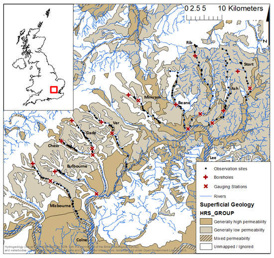 The ten study rivers form part of the Thames headwater network and are tributaries of the Colne (Misbourne, Chess, Bulbourne, Gade and Ver) or the Lee (Mimram, Beane, Rib, Ash and Stort) with stream lengths of 15 to 46 km (Figure 1 and Figure 2). The Colne catchments are a little higher and wetter than those of the Lee (30–250 m AOD and 700–750 mm; 30–200 m AOD and 600–650 mm, respectively) and the superficial deposits most extensive in the east (75% in the Rib, Ash and Stort catchments). The hydrological regimes of the Colne tributaries and also the Mimram are characteristic of chalk streams in the area, heavily attenuated (mean Base Flow Index 0.88), and with flow typically increasing in magnitude from October to March and decreasing from April to September. The Rib, Ash and Stort have a greater responsive component (mean Base Flow Index 0.53). Daily flow data for gauging stations on the study rivers and corresponding catchment descriptors are openly available through the UK National River Flow Archive [30,31].