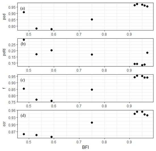 Figure 3. Relationships between Base Flow Index and weighted evaluation metrics. (a) POD; (b) POFD; (c) f; (d) CCR.