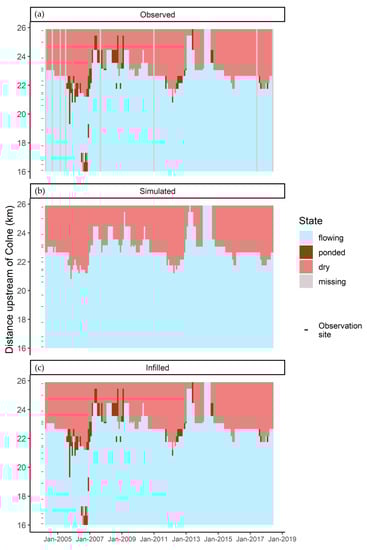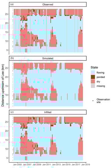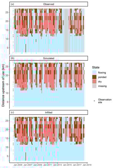 Figure 6. Monthly time series of observed (a), simulated (b), and infilled (c) hydrological state on the Misbourne, where infilled states are observations where available and simulations where observations are unavailable. Hydrological state is assumed to be consistent along observed reaches due to the high spatial resolution of the data.