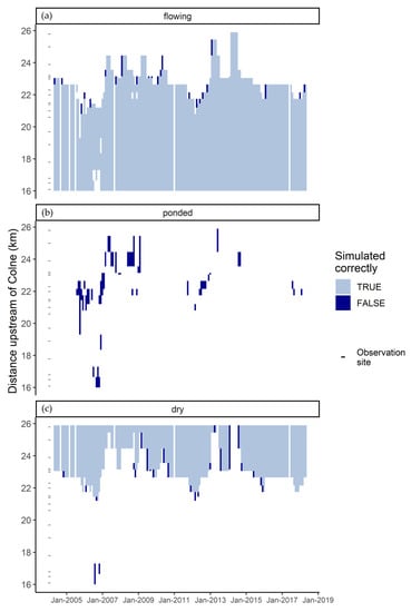 Figure 9. Monthly time series indicating whether flowing (a), ponded (b), and dry (c) states were simulated correctly and when and where the states were observed on the Ash. Hydrological state is assumed to be consistent along observed reaches due to the high spatial resolution of the data.