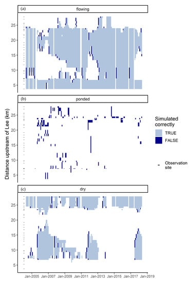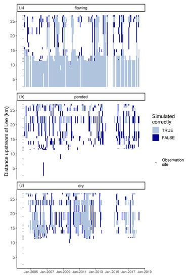 Figure 7. Monthly time series indicating whether flowing (a), ponded (b), and dry (c) states were simulated correctly and when and where the states were observed on the Misbourne. Hydrological state is assumed to be consistent along observed reaches due to the high spatial resolution of the data.