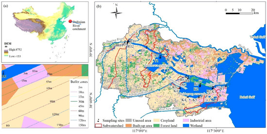 (a) The Duliujian River catchment in China; (b) Sampling sites and land-use types in the Duliujian River catchment based on Landsat satellite data in 2019. K, T represents the sampling sites of Beidagang and Tuanbowa Reservoir, R1–R6 denotes the sampling sites of downstream, R7–R12 indicates the sampling sites of upstream. (c) Buffer zones of different river areas (trunk and tributaries).